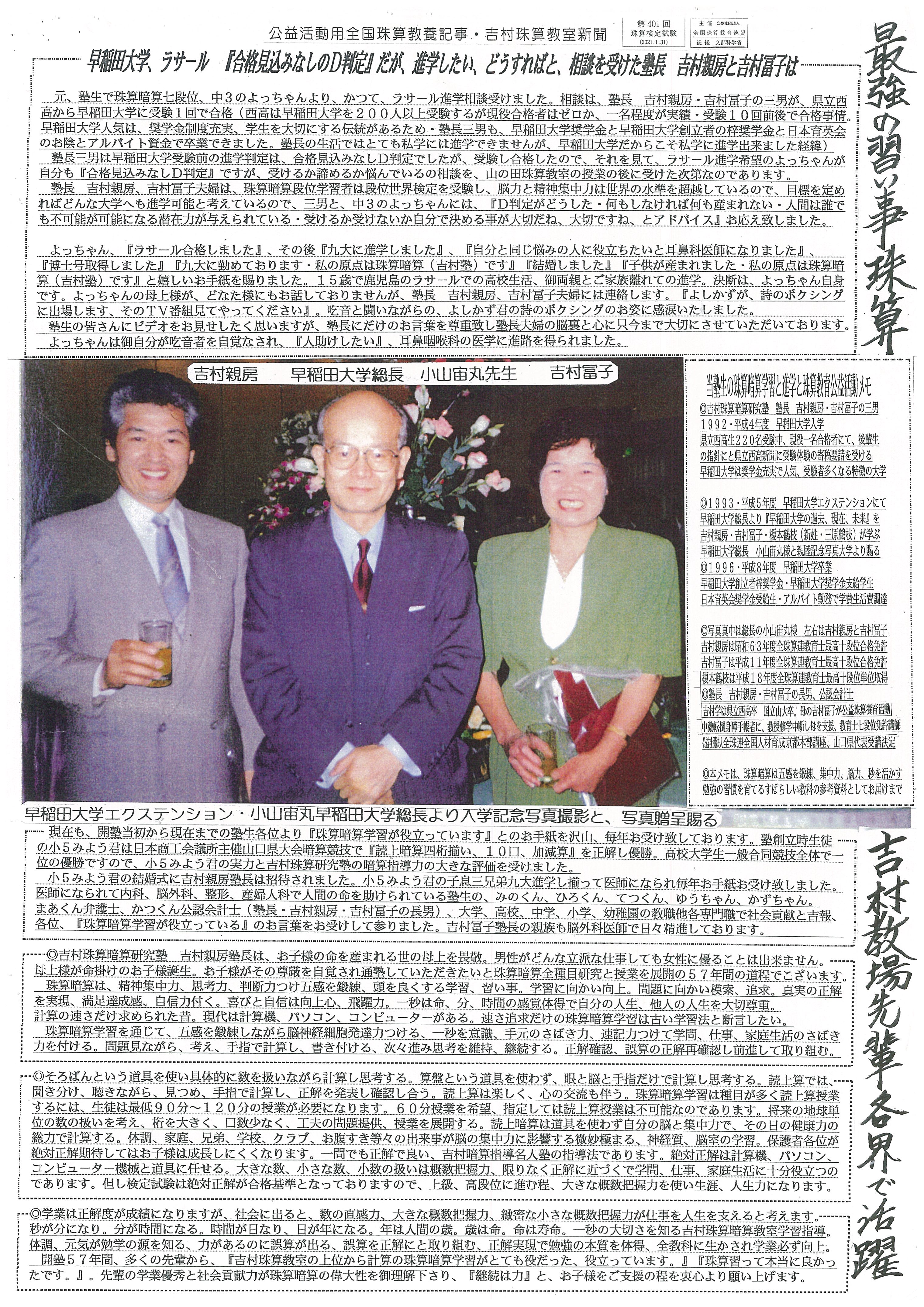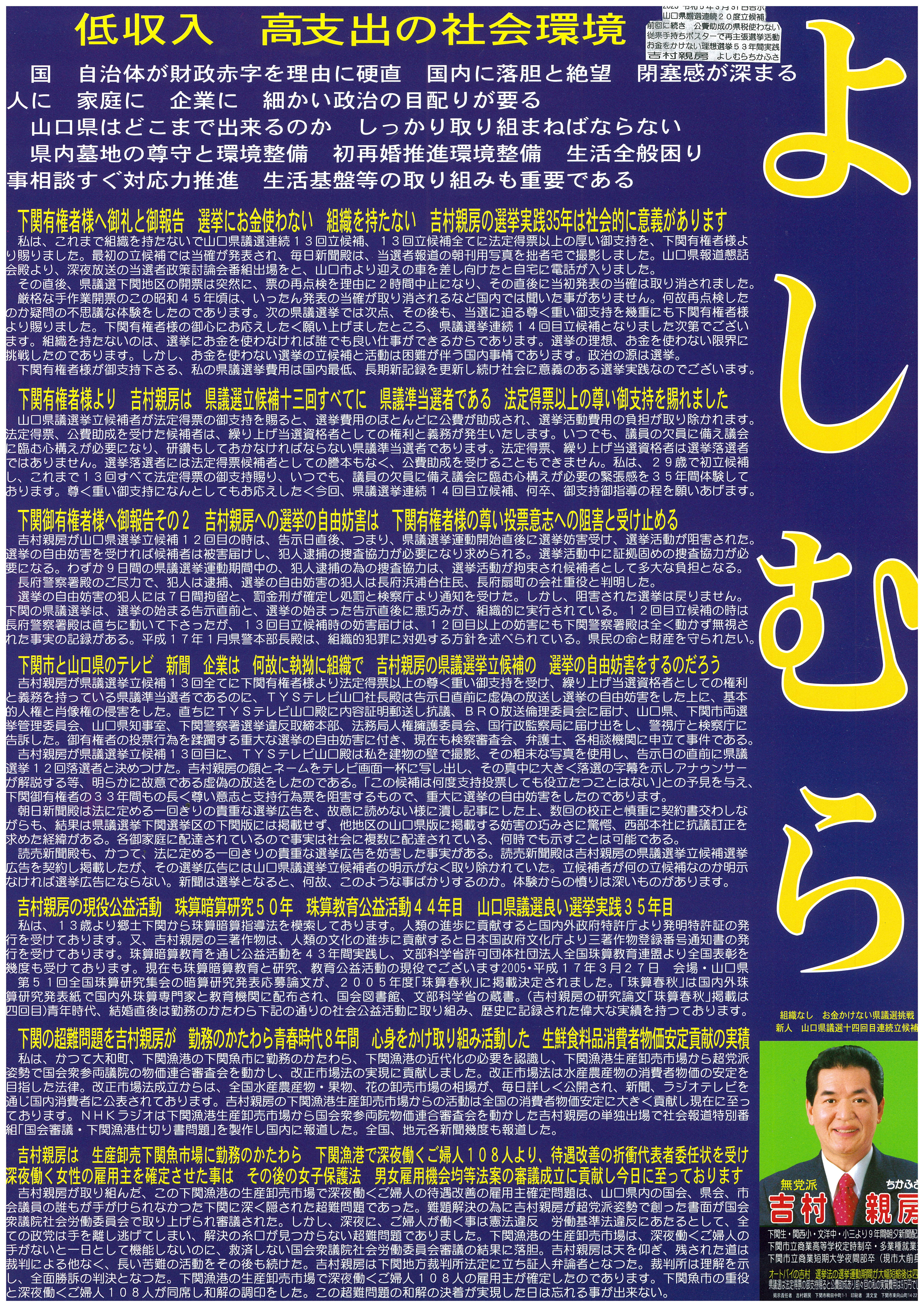 また、敢えて親兄弟知人友人に投票依頼しない姿勢に意志を込め、自ら理想とする選挙の限界に挑戦を実践し、真面目に立候補。当選に次点候補故に公私に卑劣な妨害と弾圧に遭遇の54年間なのであります。吉村親房の県議選は、下関御有権者の御支持、無違反、お金を使わない選挙、いずれも日本新記録であり、世界の新記録でもあるのでございます。吉村の目指す世界の模範選挙と人類の進歩と文化に貢献の指標は、次代を担う青少年たちへの指針となるものでございます。