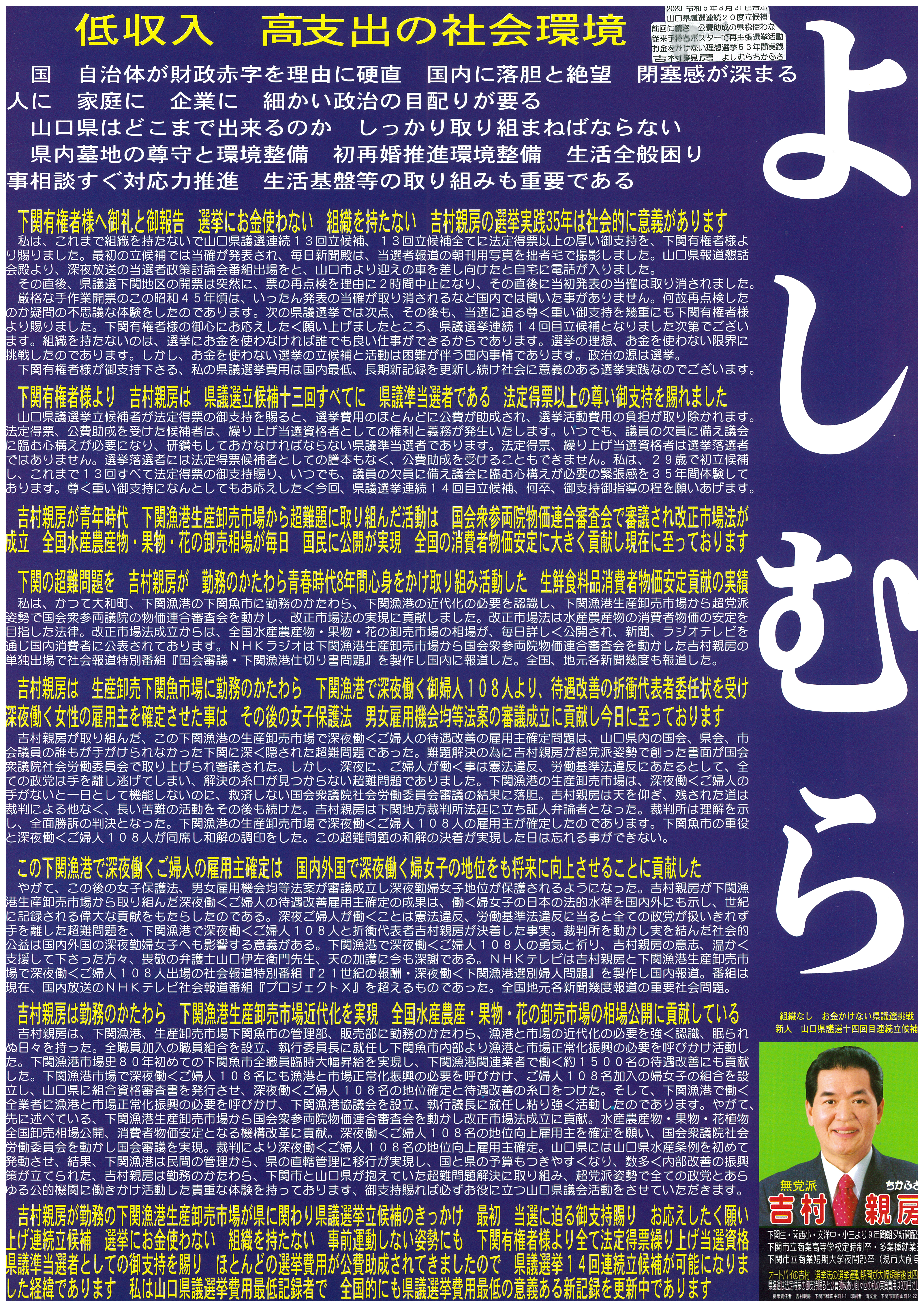 以下の縦書き文書は、令和5年4月9日施行の山口県議会議員選挙の吉村親房の政見を簡潔に箇条書きにしたものでございます。どうぞ拡大してご覧ください。