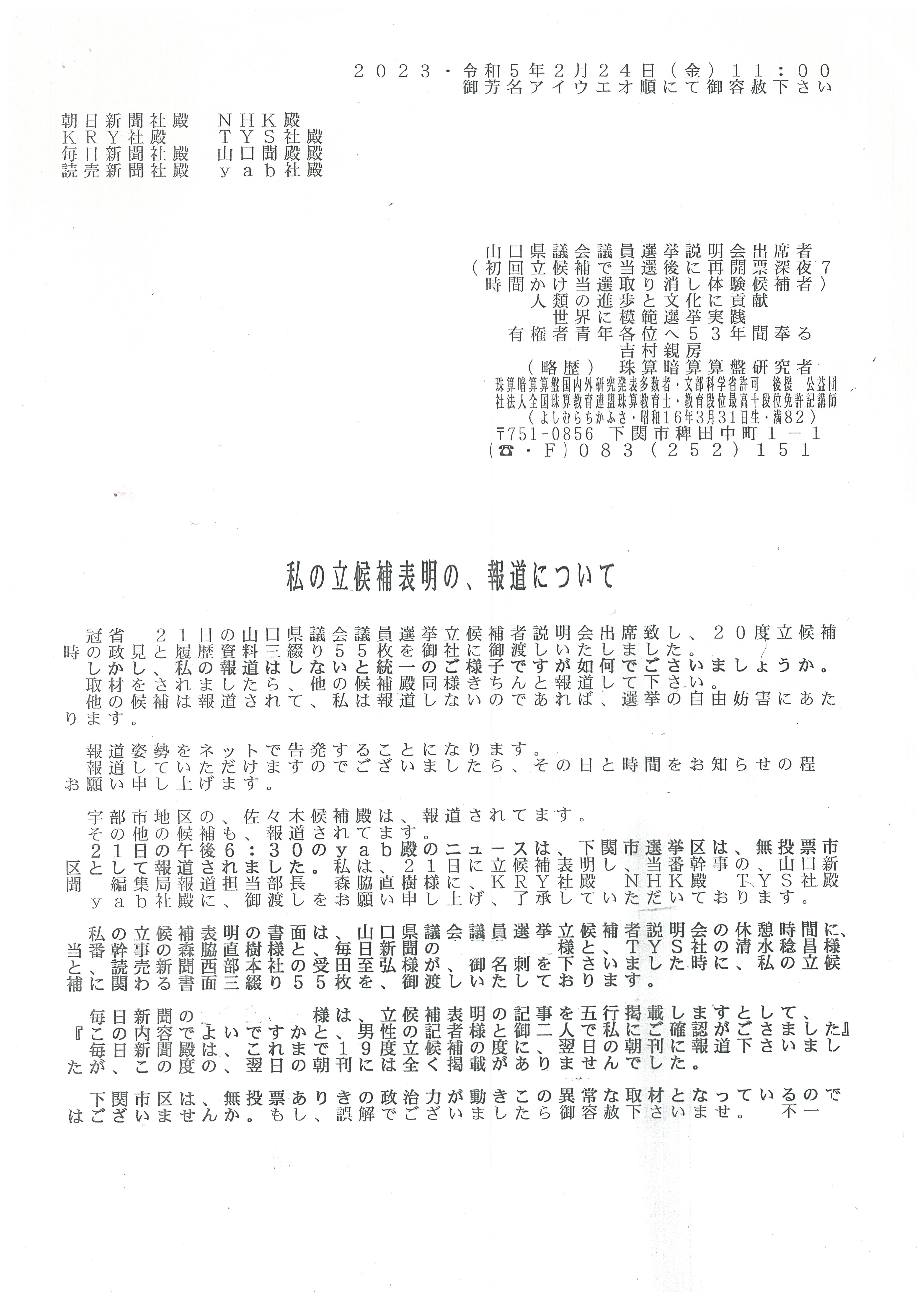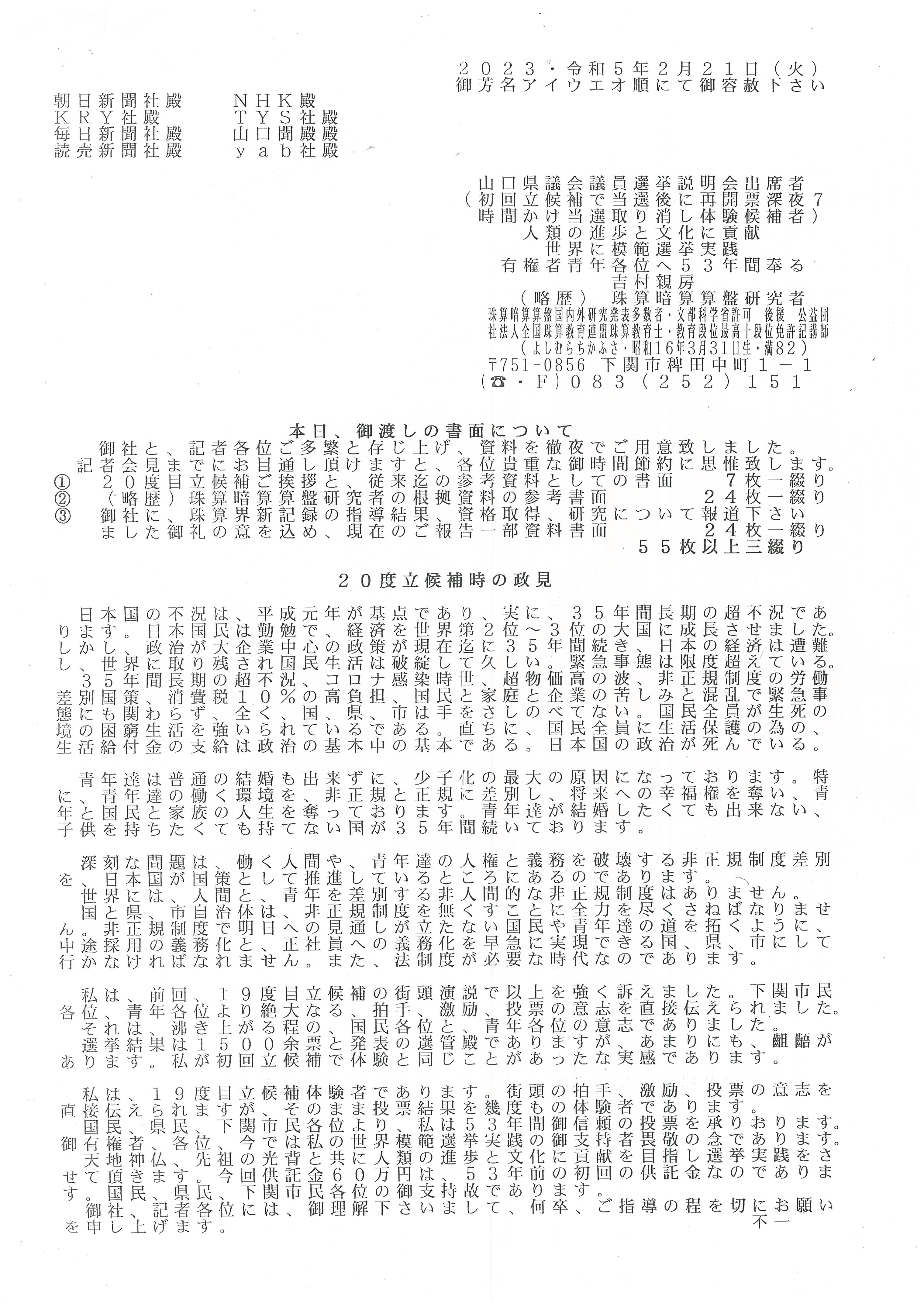 以下に、令和5年2月24日に下関市役所で行なわれた、新聞各社とテレビ局各社による吉村親房の山口県議会議員選挙立候補の共同記者会で吉村親房が報道各社にお渡しした書面です。
