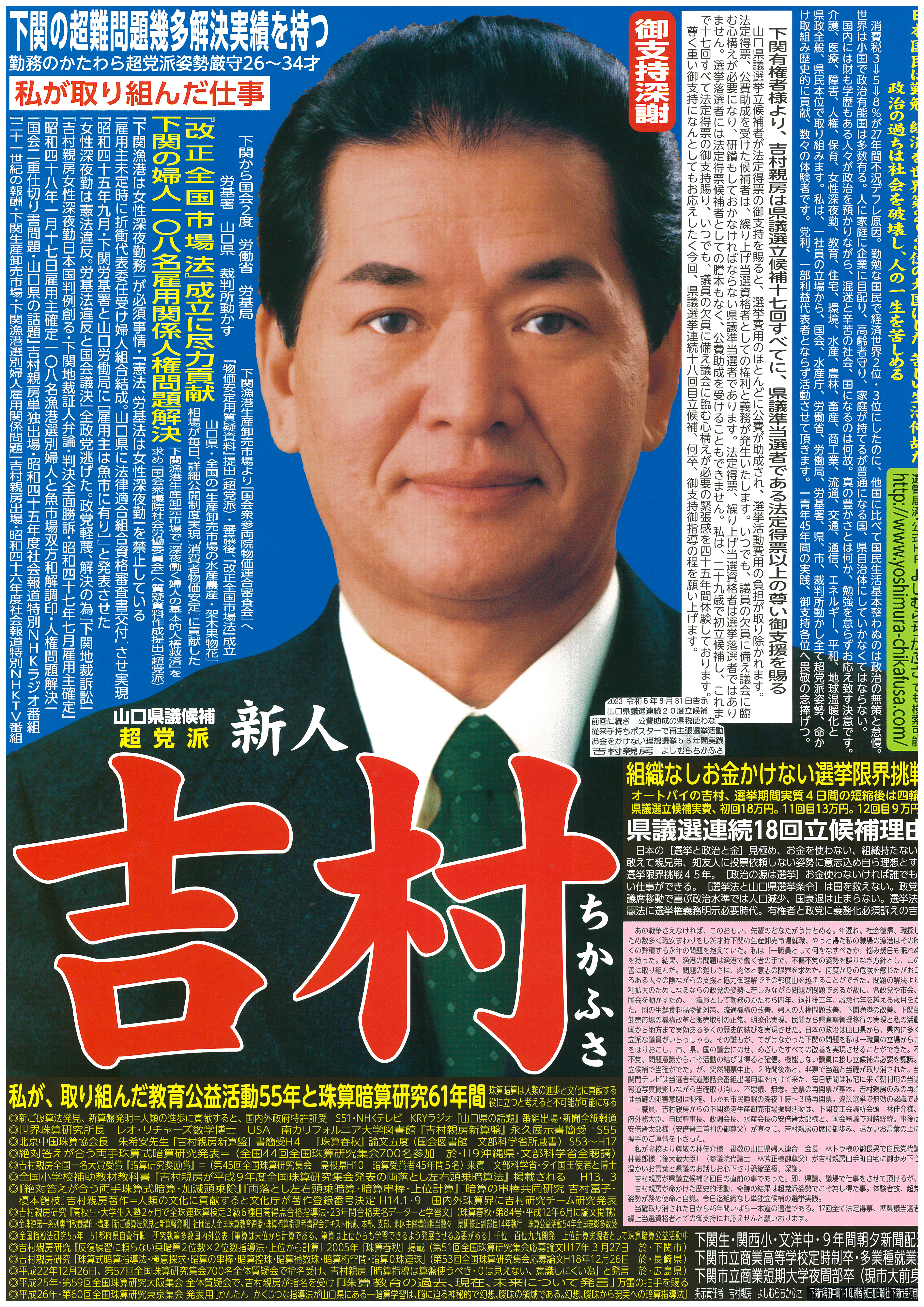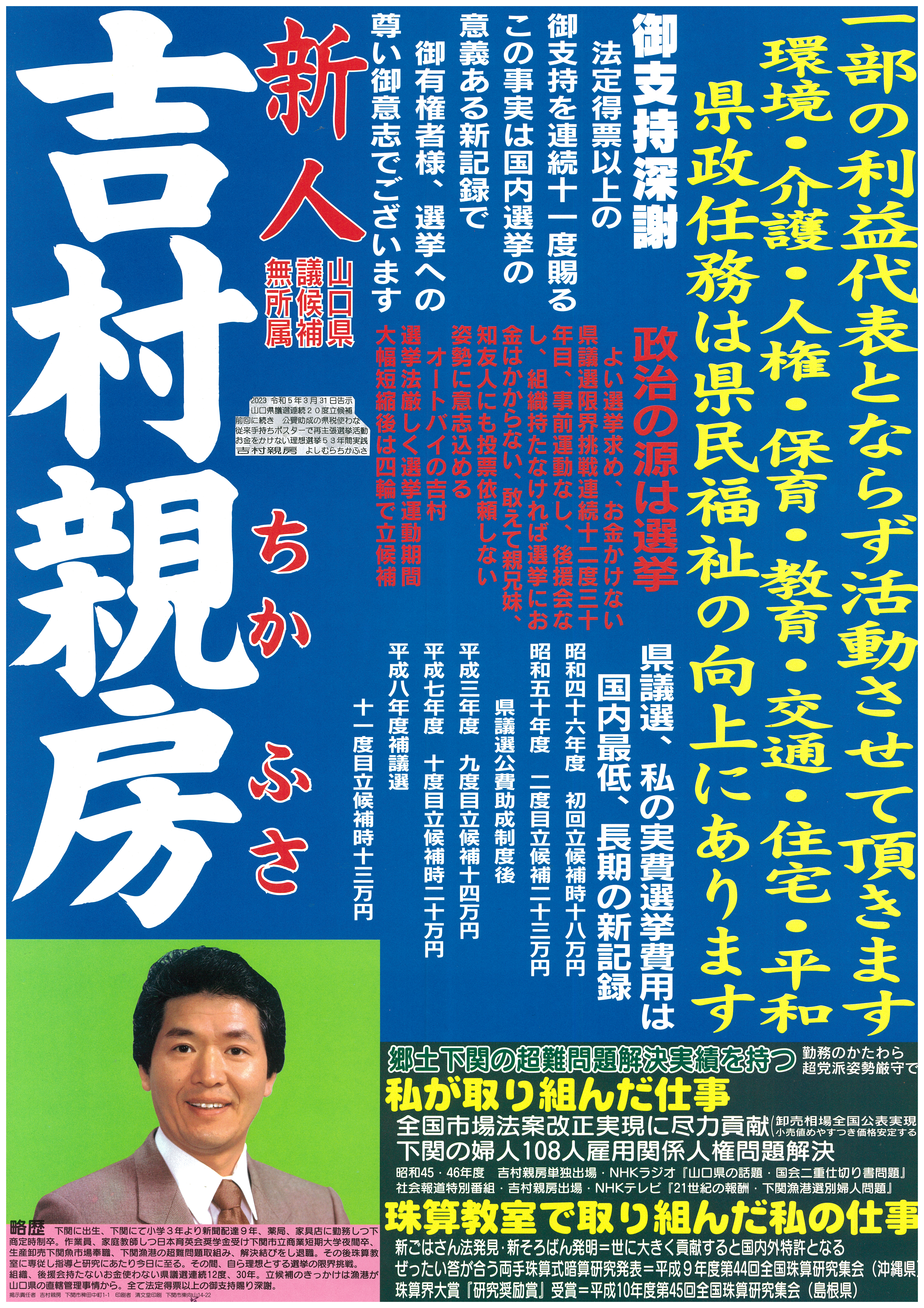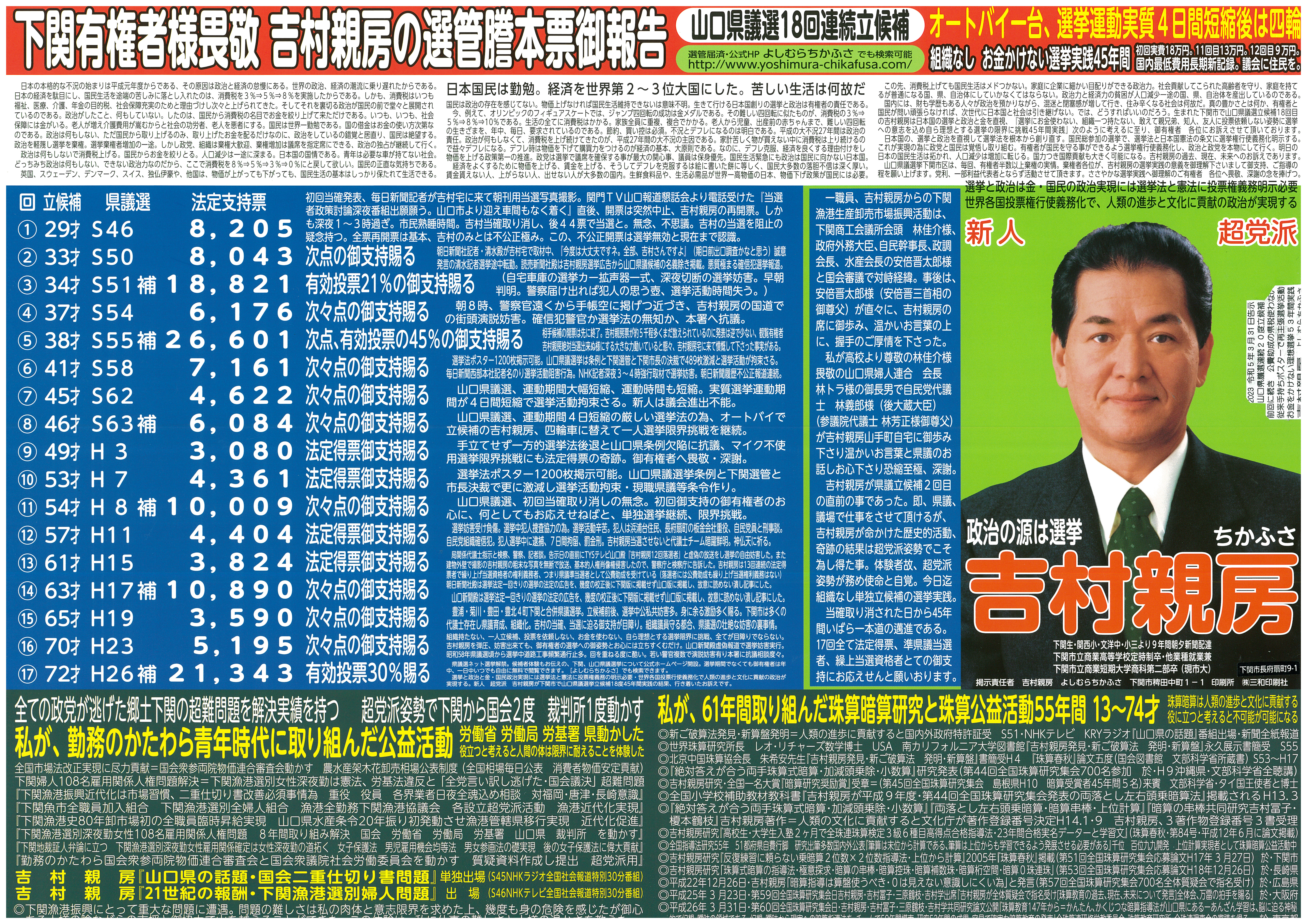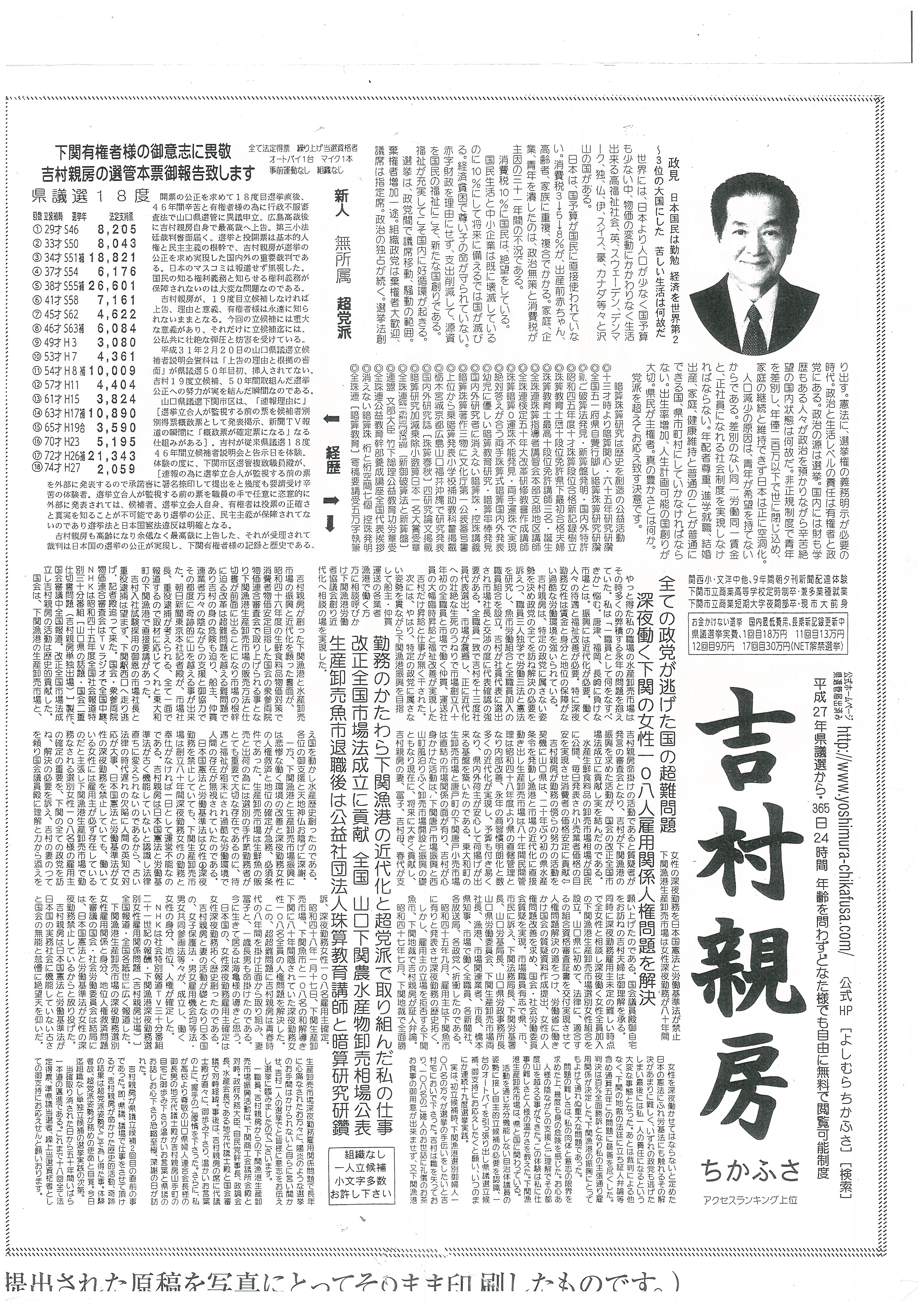 長きにわたり吉村親房の理想選挙実践を御支持くださる下関市御有権者の皆様の尊い投票行為は、
