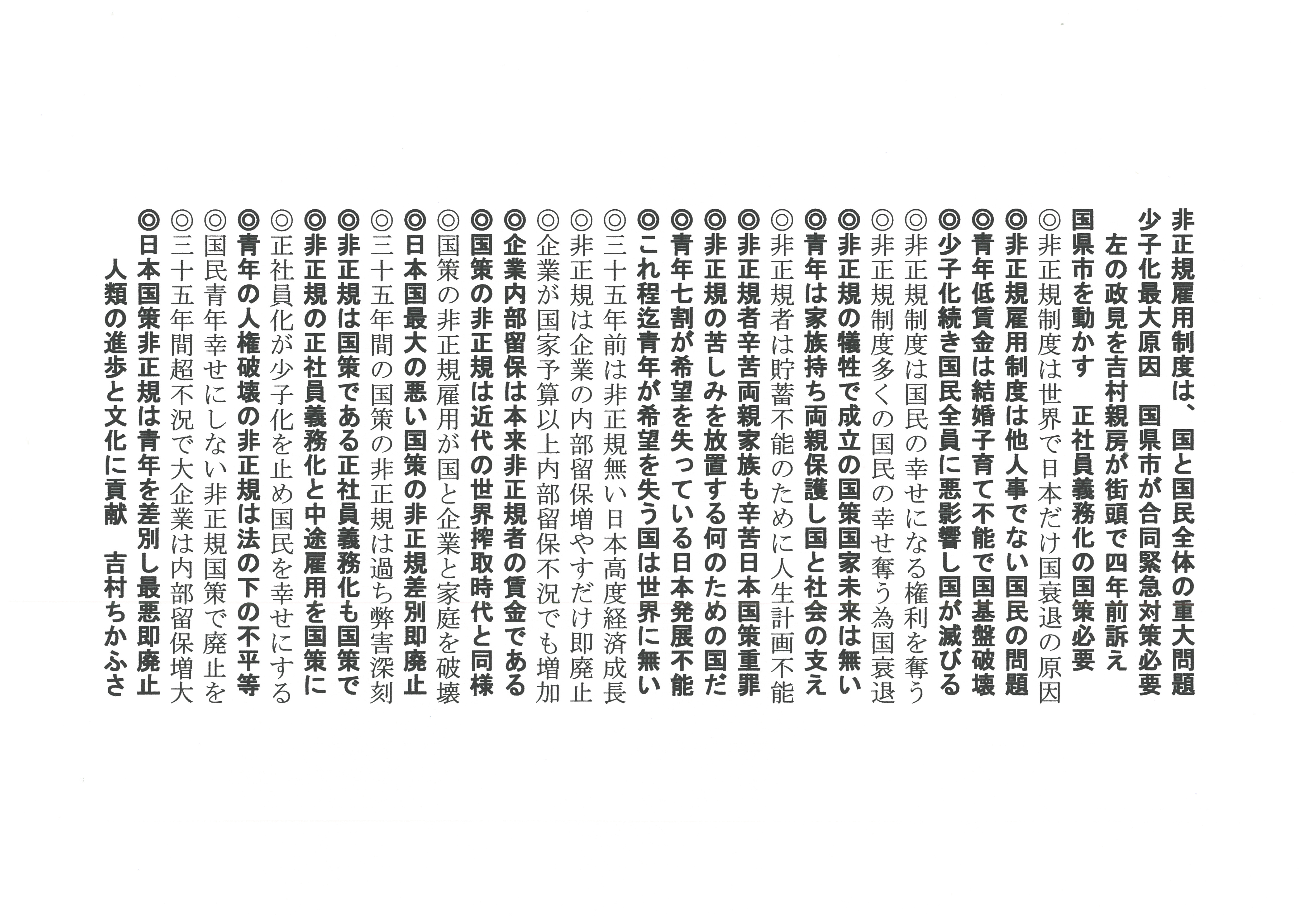 吉村親房は、非正規社員という弱い立場に置かれた国民のために、また、「少子化と低賃金と経済不況の最大の原因である非正規制度の廃止」と「正社員の義務化」と「中途雇用の義務化」を、全国民のため、日本国のためにお訴え致します。