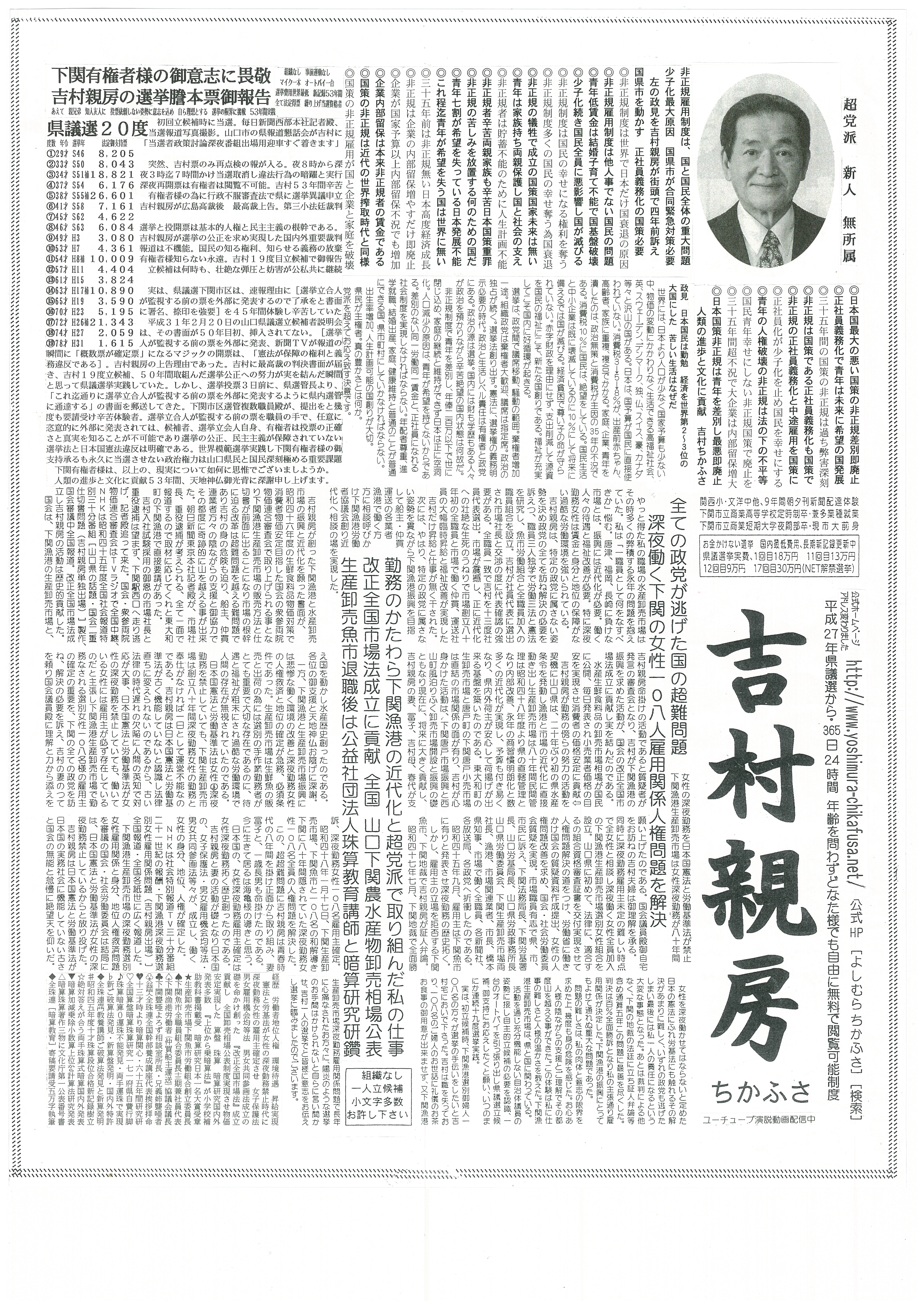 長きにわたり吉村親房の理想選挙実践を御支持くださる下関市御有権者の皆様の尊い投票行為は、