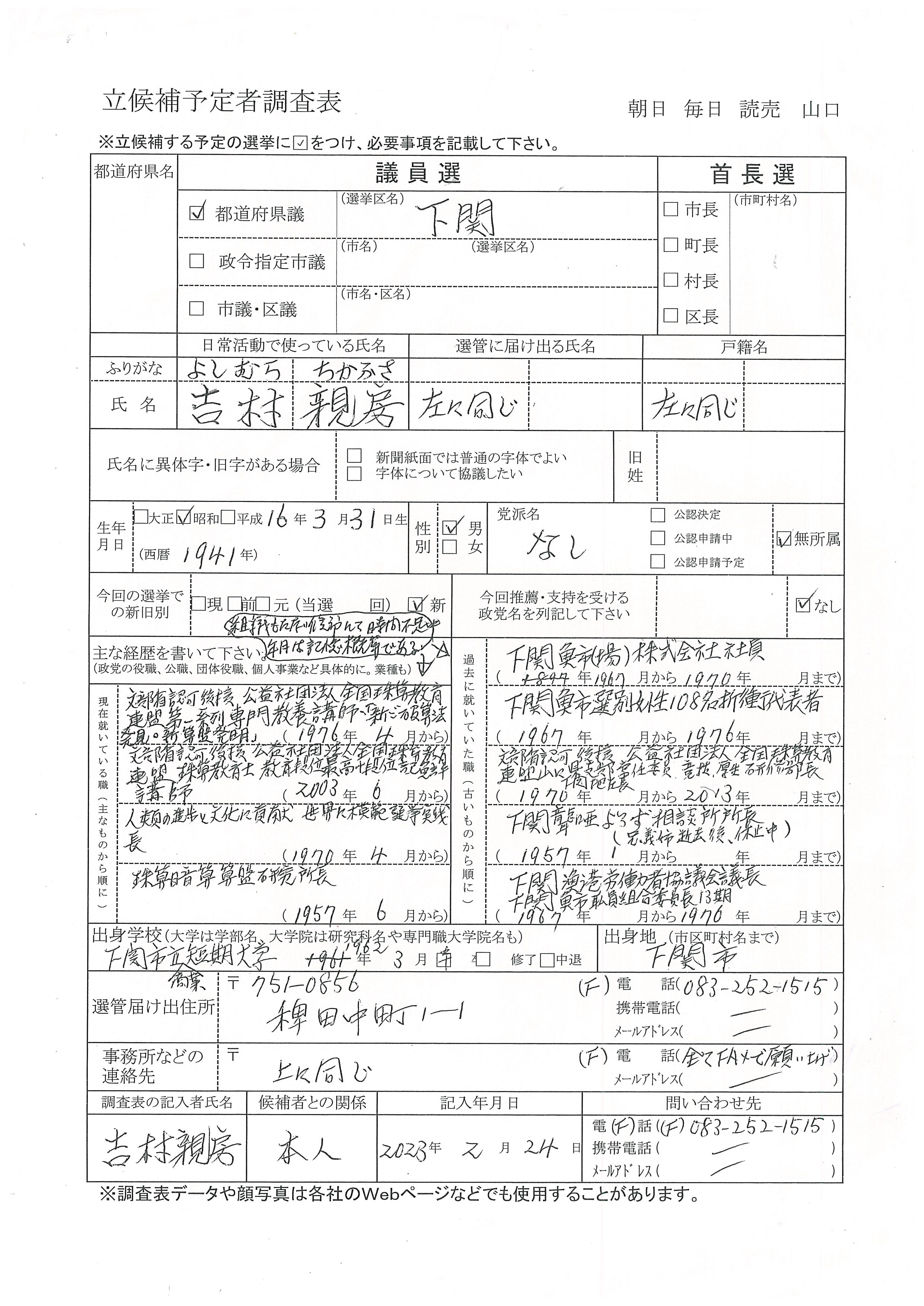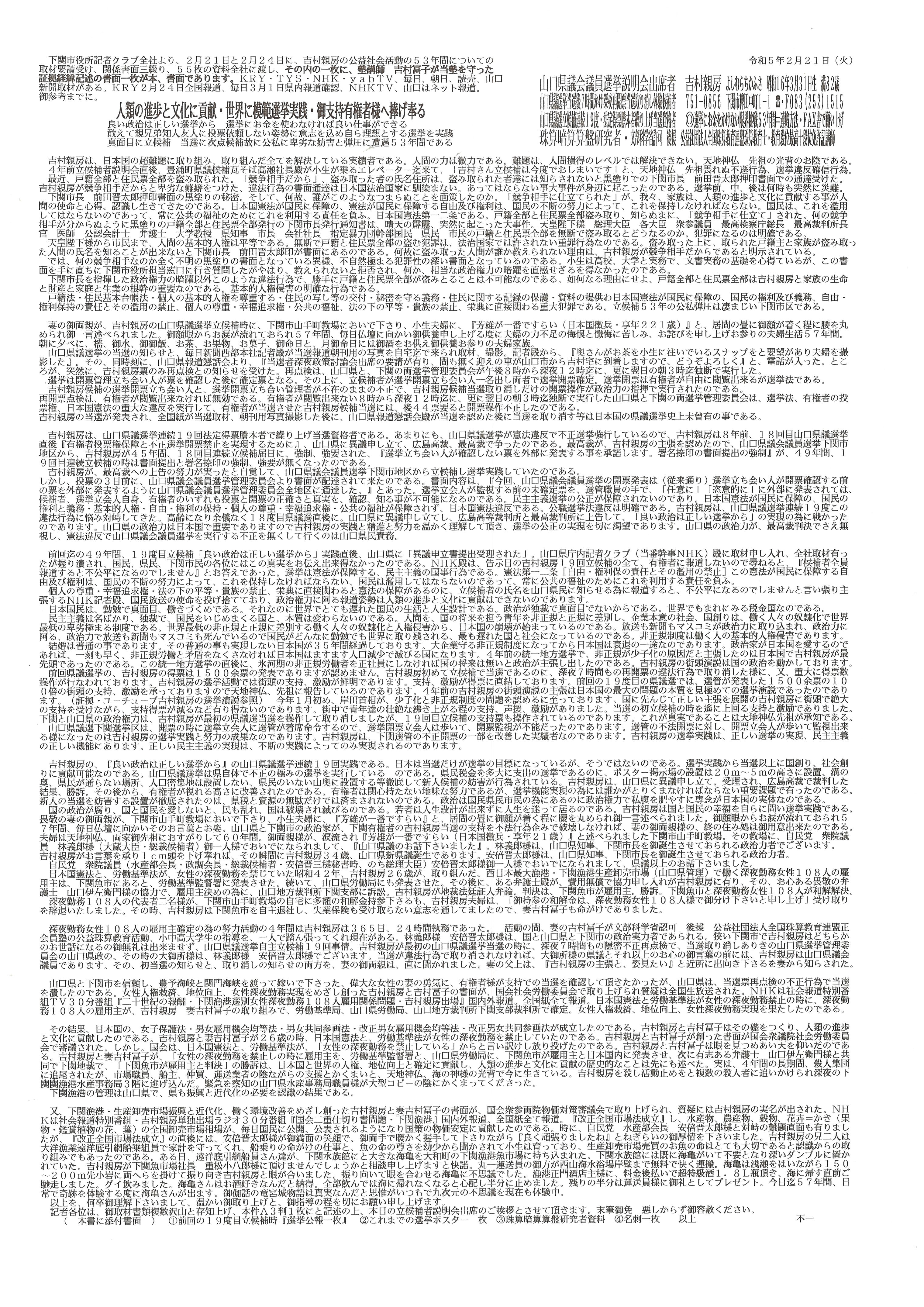 以下に、令和5年2月24日に下関市役所で行なわれた、新聞各社とテレビ局各社による吉村親房の山口県議会議員選挙立候補の共同記者会で吉村親房が報道各社にお渡しした書面です。